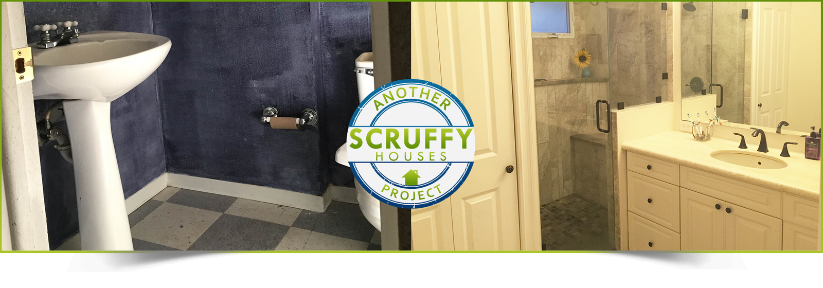 You know you’re in for a fun makeover when you have a matching set of brown toilet, sink, and tub. Pair that with a teal wall and a clay tile floor and you’re bound to have a great time. We discovered a window behind the tub (along with duct tape and sheetrock), the floor was tiled directly to the plywood, and the corners of the bathroom were curved and loaded with solid plaster. The demo took two full days because the tub was built directly into the wall and buried in cement and the plaster and chickenwire was thick everywhere. But the magic started happening shortly after that with a full marble floor to ceiling tile job, new window and fixtures, a marble basketweave floor and a soft blue accent on the walls. It turned out great!